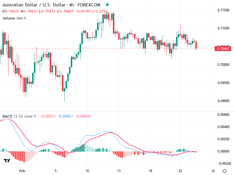 يظهر الرسم البياني لفترة حديثة حالة من التماسك. لا توجد أنماط شموع مميزة مثل المطرقة أو الابتلاع تعطي إشارات واضحة عن الاتجاه. يظهر الاتجاه العام جانبيًا مع ميل هبوطي طفيف بعد ذروة تتجاوز 0.71500. تتواجد المقاومة حول 0.71500 مع تكون الدعم بالقرب من 0.70000.