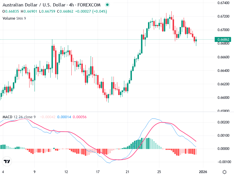 يقدم تحليل زوج العملات AUD/USD لمدة 4 ساعات إشارات مختلطة حيث توجد اتجاهات متعارضة في الشموع وMACD. تشير الشارت إلى اتجاه صعودي ولكن بحذر.