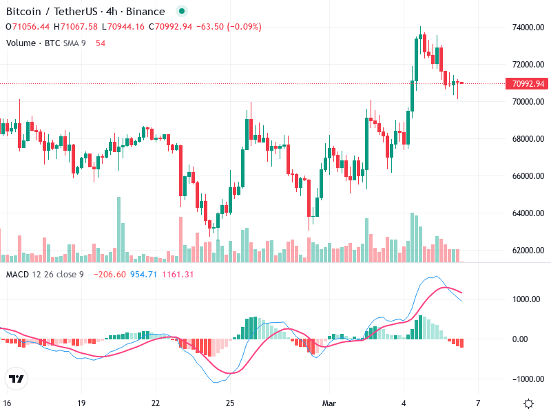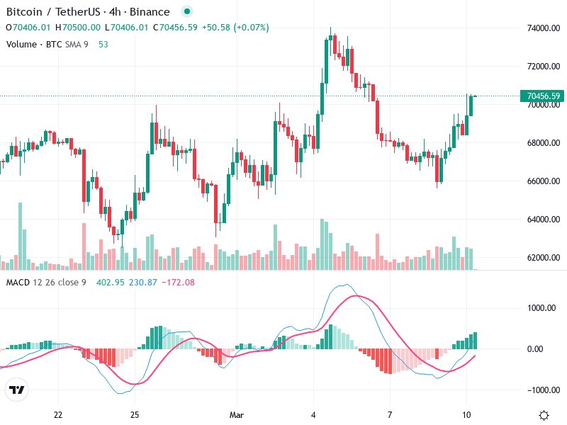 يقع مستوى المقاومة الأساسي بالقرب من 69000، حيث حدثت رفضات متعددة سابقًا. اختراق فوق هذا يمكن أن يؤدي إلى زخم صعودي إضافي.