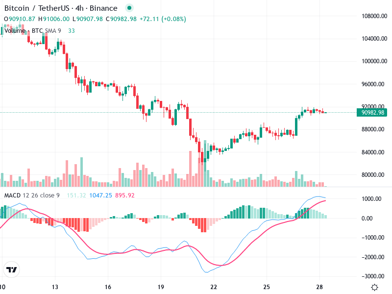 الرسم البياني لمؤشر MACD إيجابي ومتزايد، مؤكداً الشعور الصعودي، وإن كان هناك بعض الاستقرار الطفيف يعني تراجعًا في الزخم.