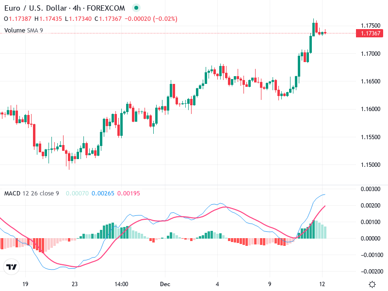 استراتيجية البيع: ابحث عن البيع أو جني الأرباح إذا أظهرت الأسعار مقاومة قوية عند 1.17500 مع تراجع في الحجم أو إشارات هبوطية من MACD.