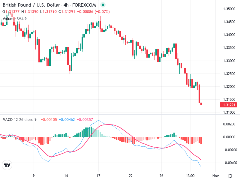 يعرض الرسم البياني عدة شموع حمراء، مما يشير إلى زخم هبوطي قوي. ظهر مؤخرًا شمعة حمراء كبيرة، مما يوحي بزيادة ضغط البيع. اتجاه الأساس العام هو هبوطي، كما هو موضح بتتابع القمم الأدنى والقيعان الأدنى. السعر يخترق مستويات الدعم السابقة حول 1.31500، مما يشير إلى احتمال استمرار الاتجاه الهابط.