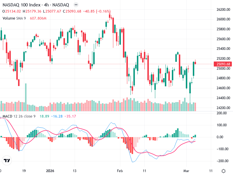 خط MACD يقع تحت خط الإشارة لكنه يتقارب، مما يوحي بضعف الزخم الهبوطي واحتمال حدوث تقاطع صعودي.