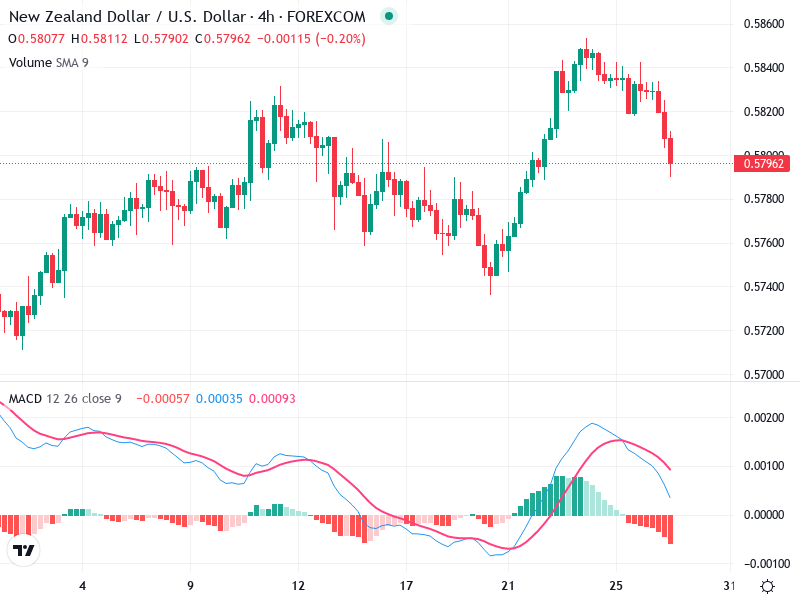الانخفاض الأخير تحت 0.58000 قد يشير إلى كسر هابط محتمل، حيث أظهرت الشموع السابقة مقاومة حول 0.58400.