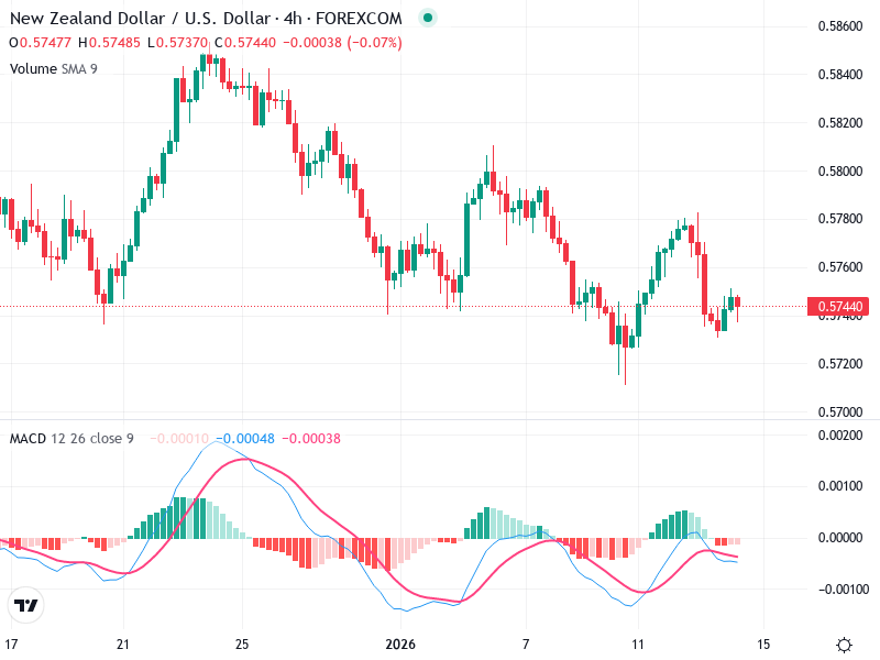 يُظهر الرسم البياني حركة جانبية بشكل عام مع تقلبات قصيرة المدى نحو الأعلى والأسفل حول مستوى 0.57440.