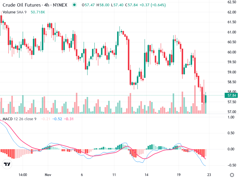 وصل السعر مؤخرًا إلى مستوى منخفض حول علامة 57.50، مما يشير إلى احتمالية وجود منطقة ارتداد إذا انعكس السعر من هنا.