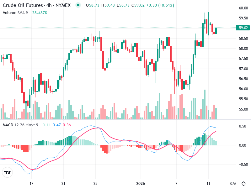 المقاومة محتملة حول المستوى 58 دولار، مع قمم سابقة فشلت في تجاوزها.