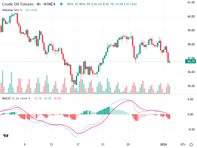يشتمل تحليل الرسم البياني لعقود النفط الخام الآجلة على تباين في الأنماط واختلاف في التوجه. تظل الحركات السعرية مقيدة ضمن نطاق معين، مع مقاومة عند مستوى 58 دولار ودعم عند مستوى 56 دولار.