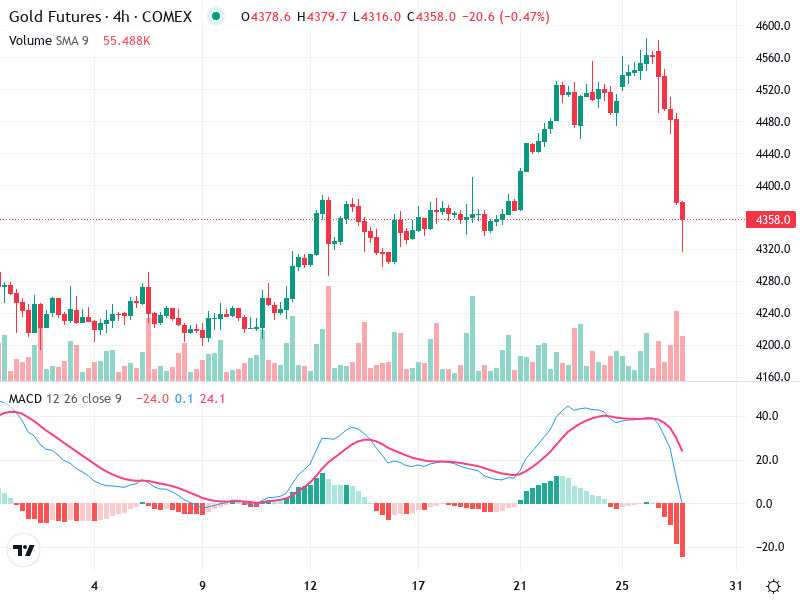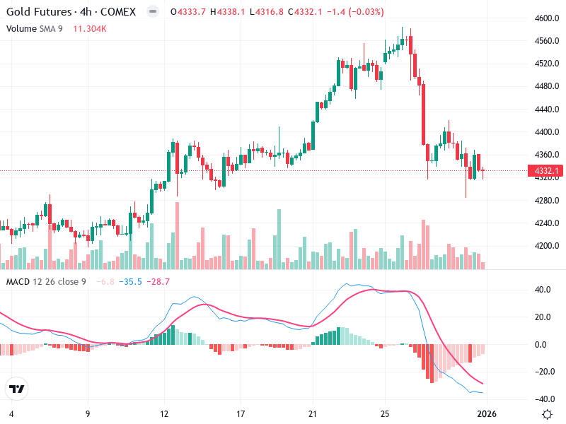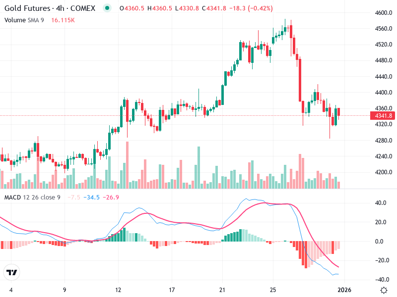 يُظهر الرسم البياني لعقود الذهب الآجلة اتجاهًا قويًا في البداية مع قمم وقيعان أعلى، تلاه انخفاض