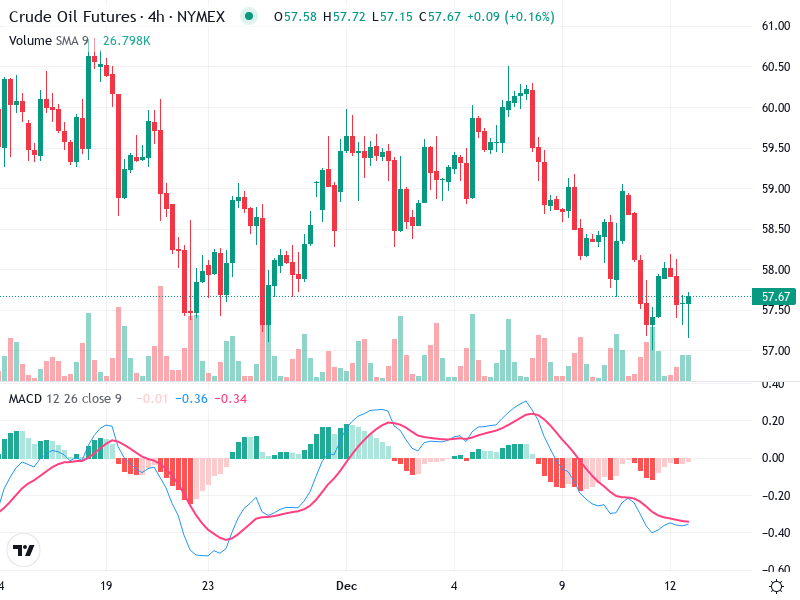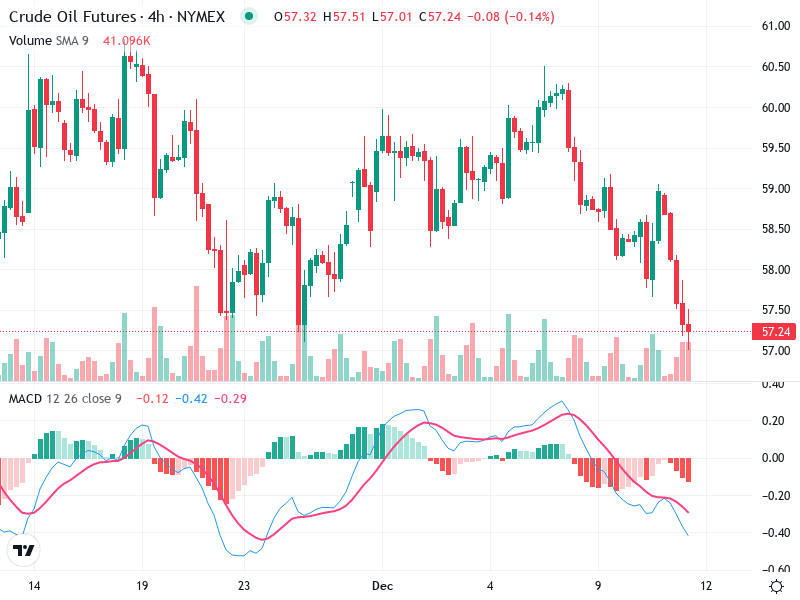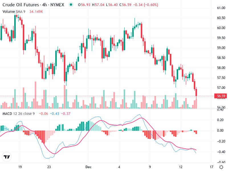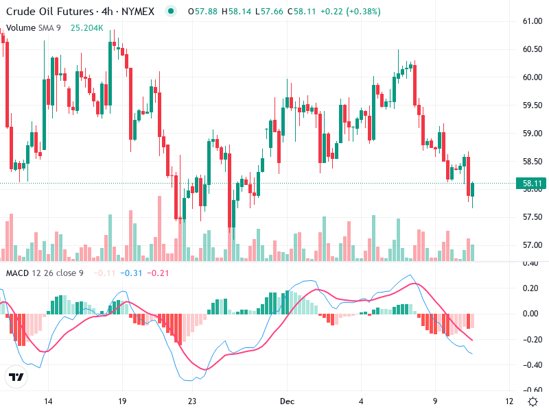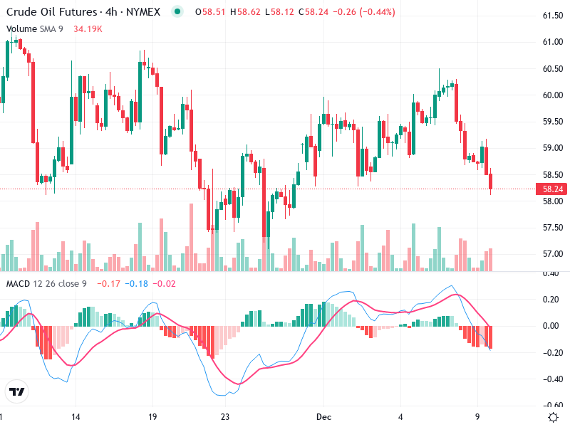 يظهر الرسم البياني للعقود الآجلة للنفط الخام علامات لاتجاه جانبي إلى هبوطي طفيف خلال الفترة الزمنية