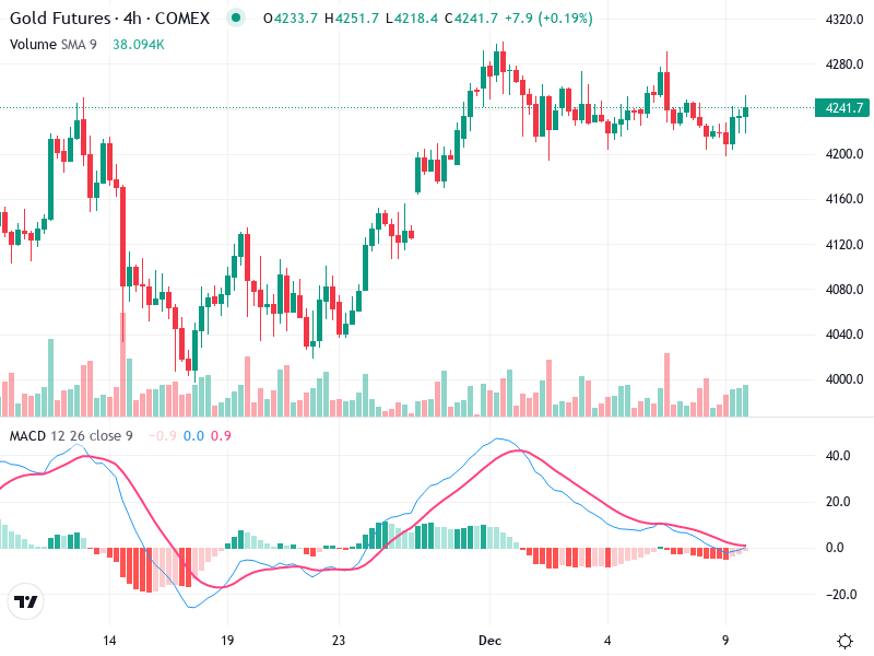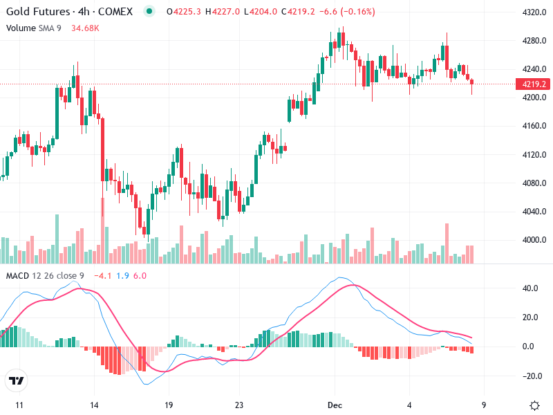 يظهر الرسم البياني للعقود الآجلة للذهب اتجاهاً متغيراً حيث يبدو أنه يتحرك من اتجاه صعودي إلى