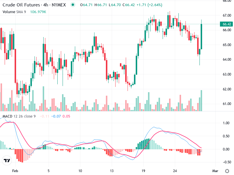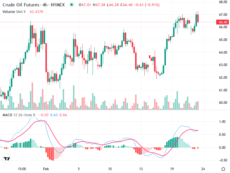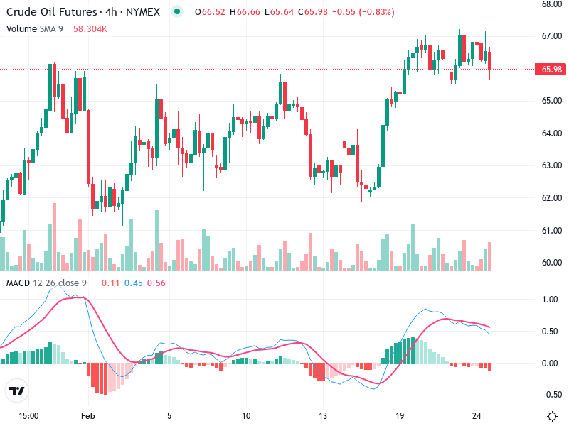 يوضح الرسم البياني لعقود النفط الخام الآجلة على مدى 4 ساعات إشارات إيجابية تشير إلى انعكاس