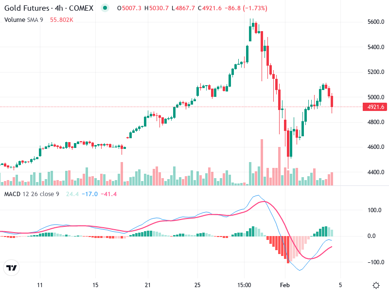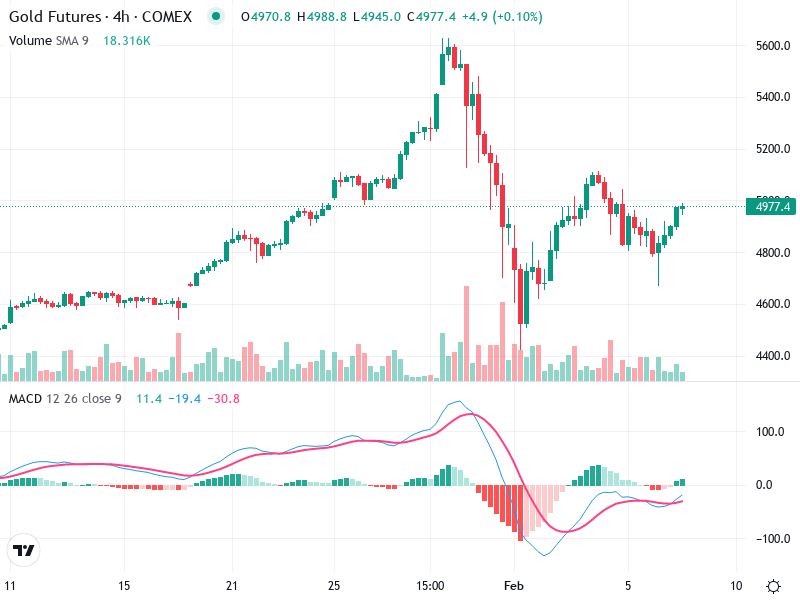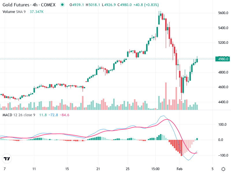 يظهر الرسم البياني للذهب على مدى 4 ساعات مؤشرات فنية متعددة. يعتبر الذهب من الأصول المهمة