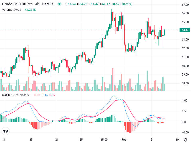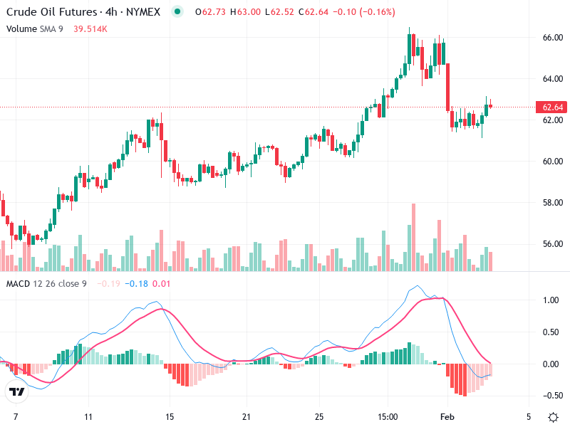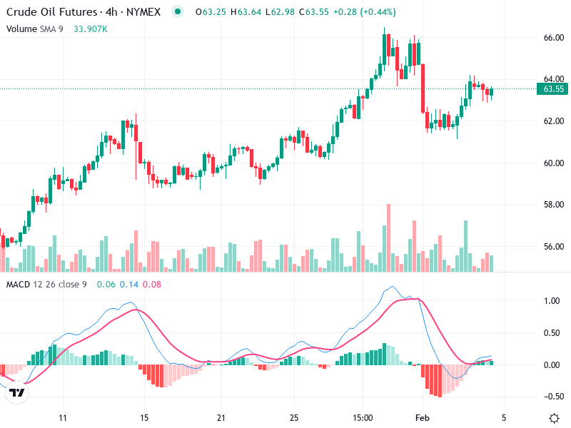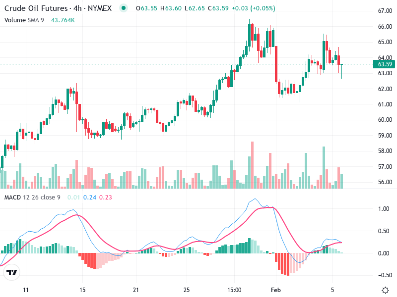 يظهر الرسم البياني للعقود الآجلة للنفط الخام على المدى الزمني لمدة 4 ساعات مؤشرات تقنية مختلفة