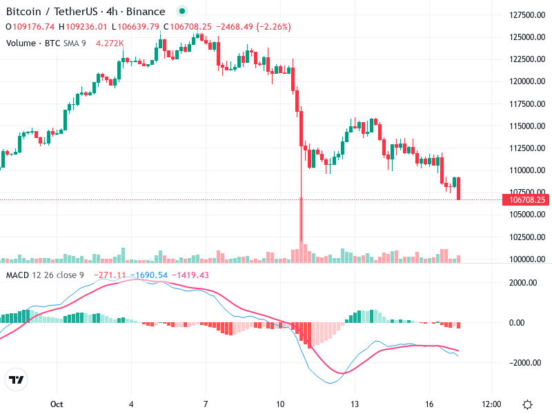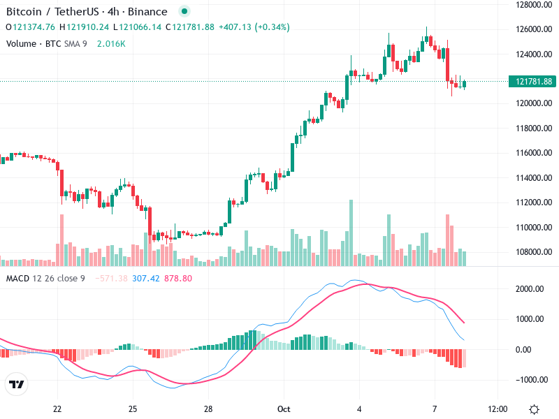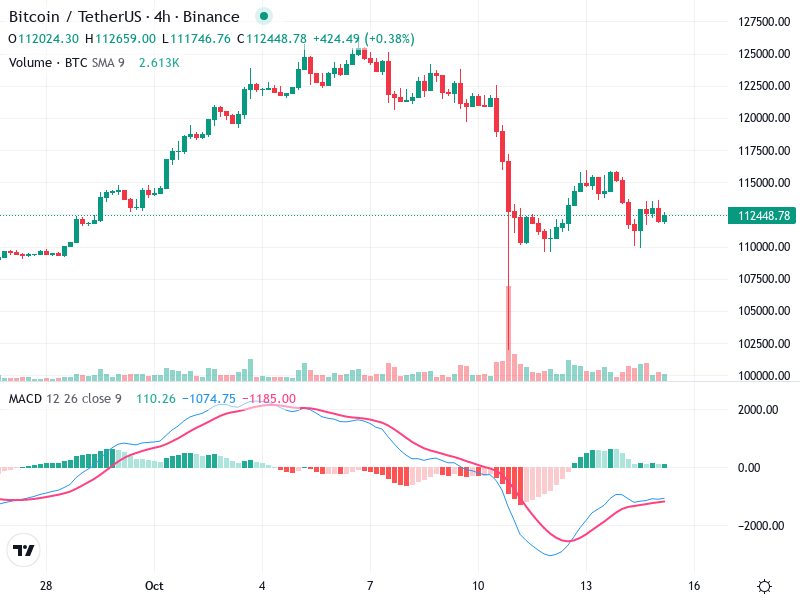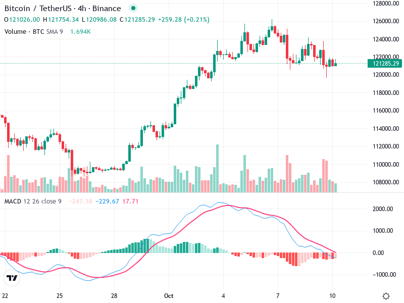 يعرض الرسم البياني لبيتكوين/تيثير على الإطار الزمني لمدة 4 ساعات ملامح هامة للمستثمرين. يتضمن التحليل الفني