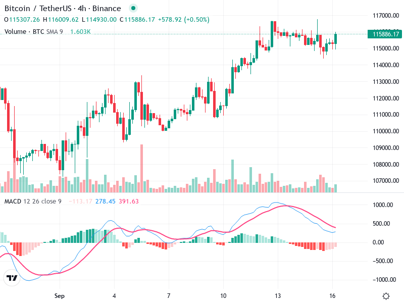 يقدم الرسم البياني تحليلاً فنياً مفصلاً لأداء Bitcoin/TetherUS. يظهر الاتجاه الحالي زخم صعودي، مع ارتفاعات وانخفاضات