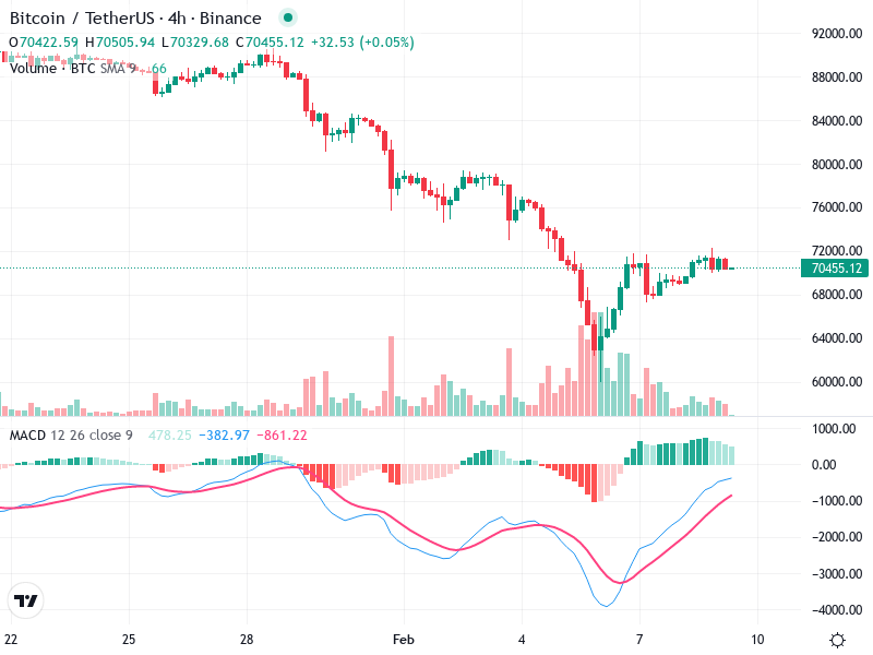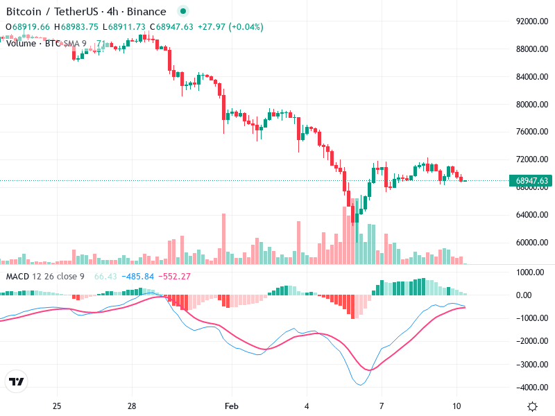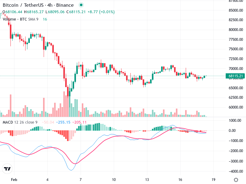 يتضمن الرسم البياني لبيتكوين/تيثر إشارات متعددة لتحركات الأسعار القادمة. تشير المؤشرات إلى احتمالية وجود تغيير في
