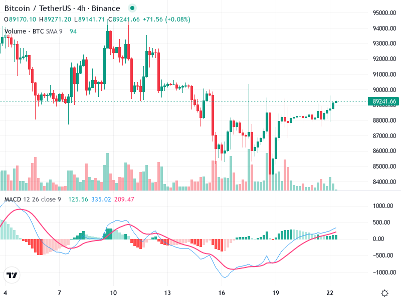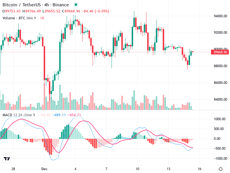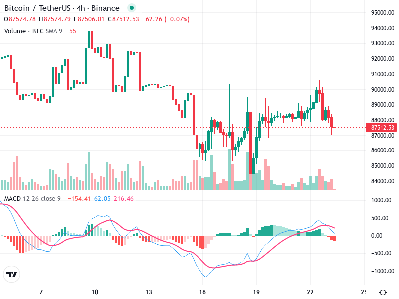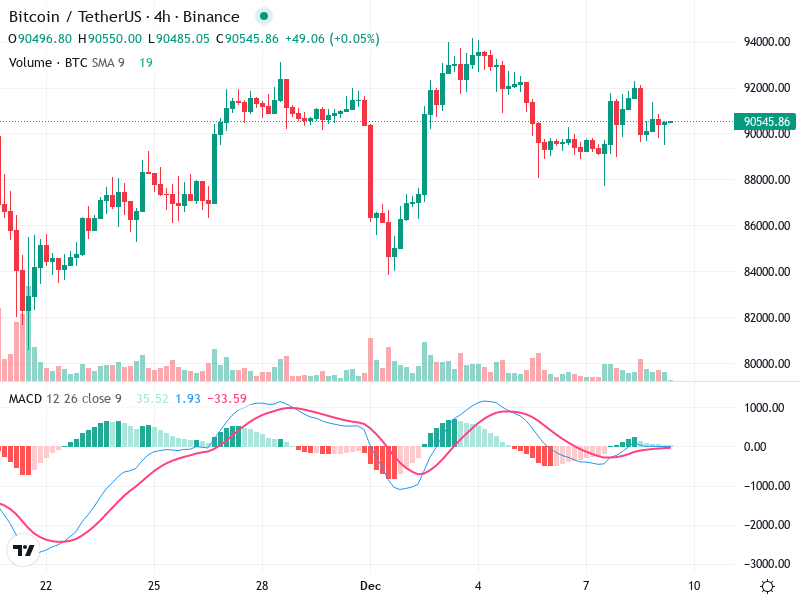 يظهر الرسم البياني لـ Bitcoin/TetherUS على مدى 4 ساعات مؤشرات تقنية متعددة يجب مراقبتها. يتضمن التحليل