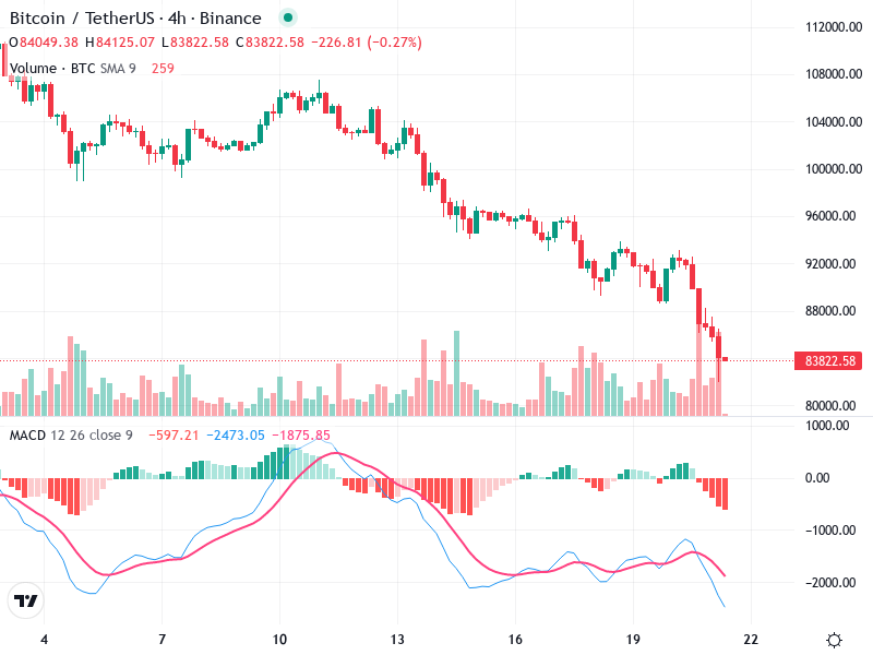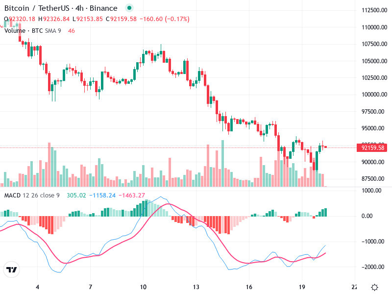 تُظهر العملة بيتكوين حاليًا اتجاهًا هبوطيًا على الرسم البياني لمدة 4 ساعات. التحليل الفني يُشير إلى