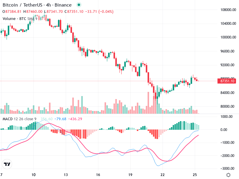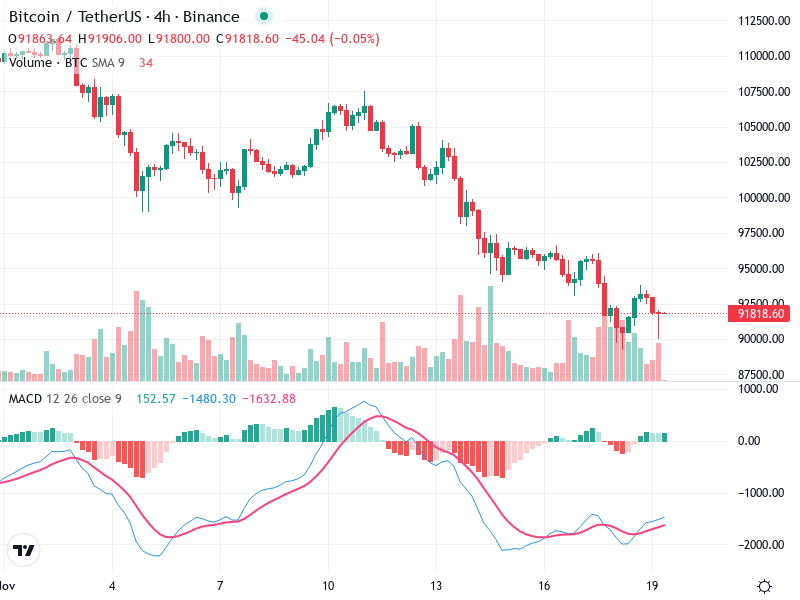 يظهر الرسم البياني للبيتكوين/تيثر مؤشرات فنية هامة تساعد في تقييم الاتجاهات المستقبلية لحركة السعر. تحتوي الرسوم