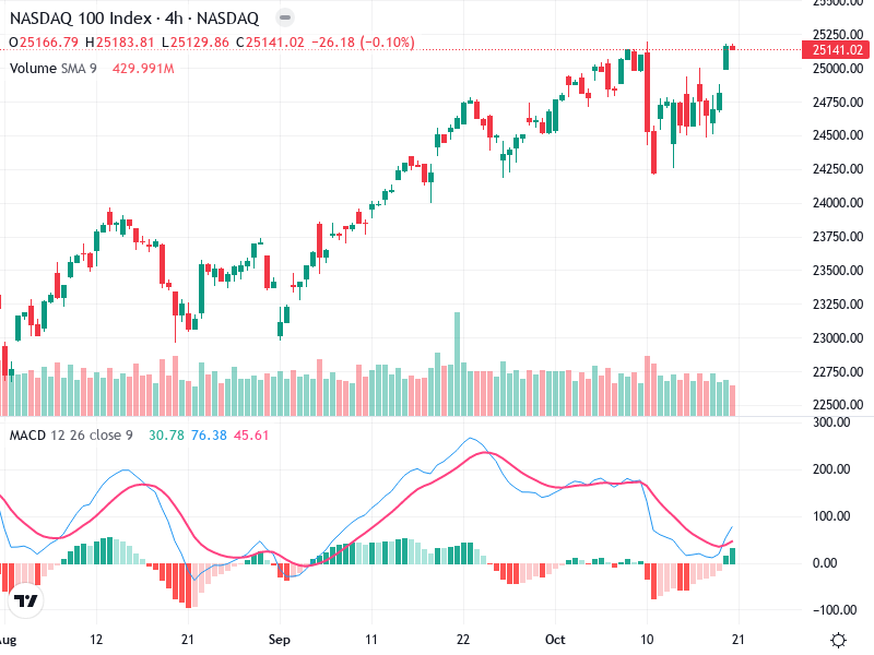 يظهر الرسم البياني لمؤشر NASDAQ 100 في الإطار الزمني 4 ساعات اتجاهًا صعوديًا بشكل عام مع