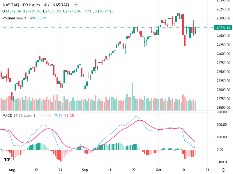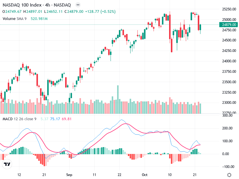 يُظهر مؤشر ناسداك 100 نمطًا صعوديًا في الإطار الزمني للأربع ساعات، مع محاولات التعافي بعد الانسحاب