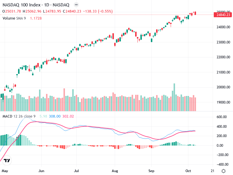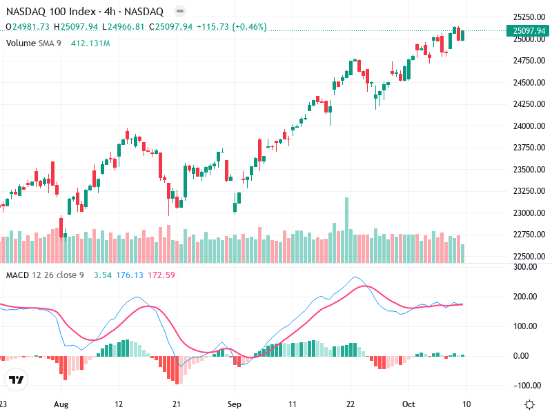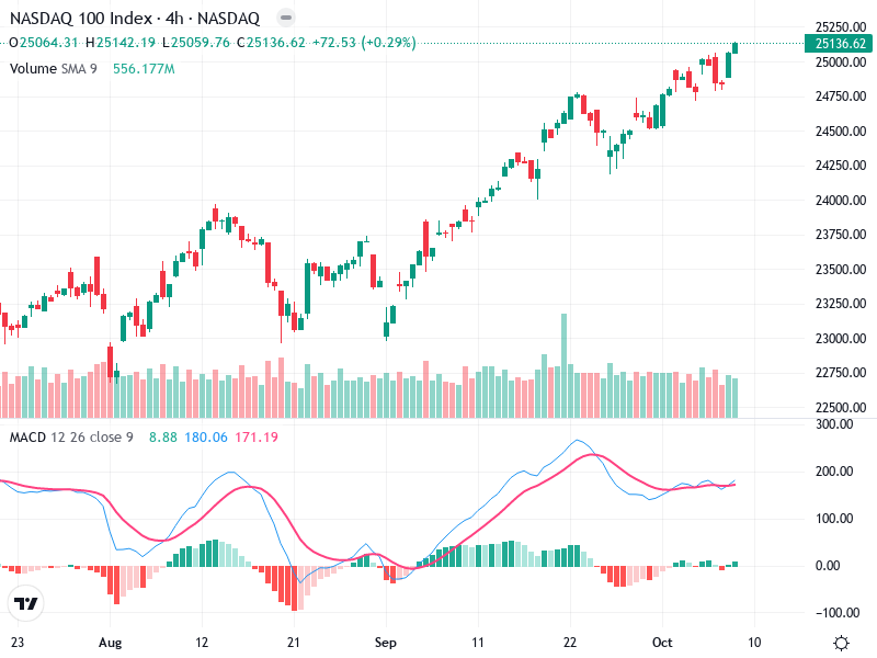 يُظهر الرسم البياني لمؤشر ناسداك 100 اتجاهًا تصاعديًا منذ منتصف أغسطس بفضل سلسلة من القمم والقيعان