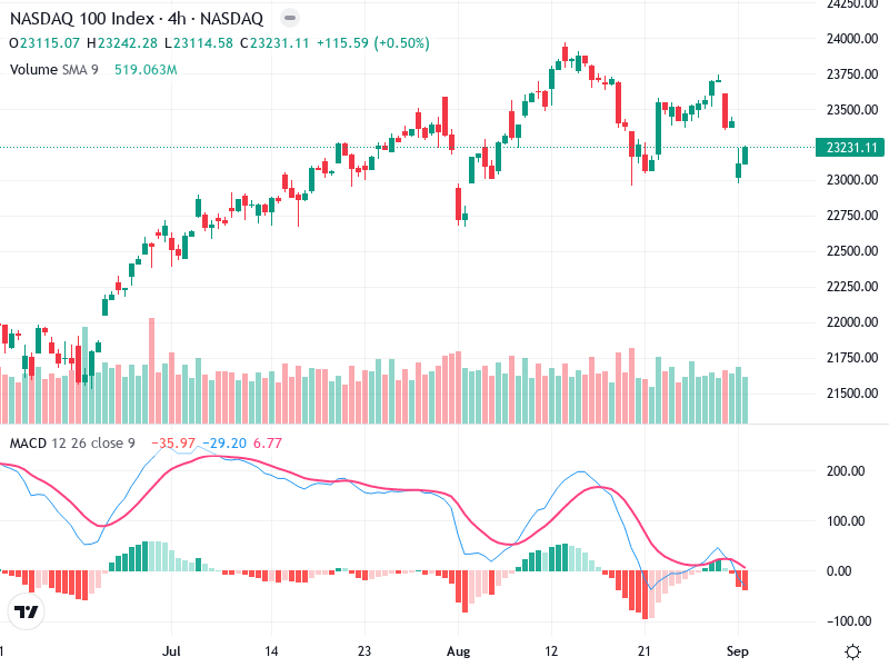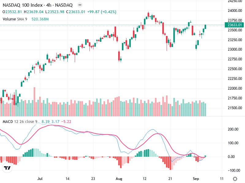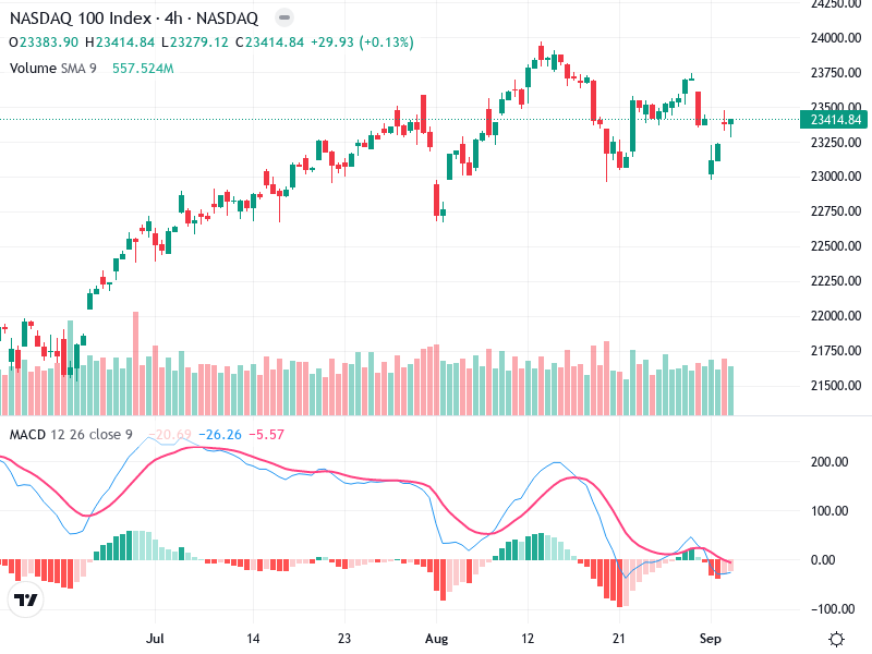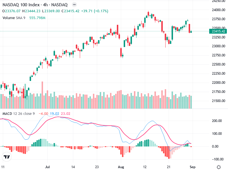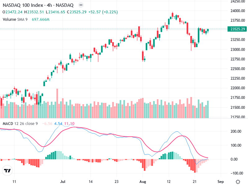 يوضح الرسم البياني الأربع ساعات لمؤشر NASDAQ 100 تحركات السعر الأخيرة والاتجاهات العامة. يشير التحليل الفني