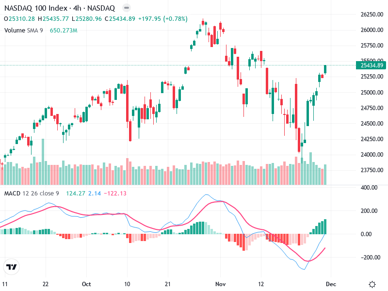 يظهر الرسم البياني لمؤشر ناسداك 100 على مدى 4 ساعات أن الاتجاه العام يمر بمرحلة من