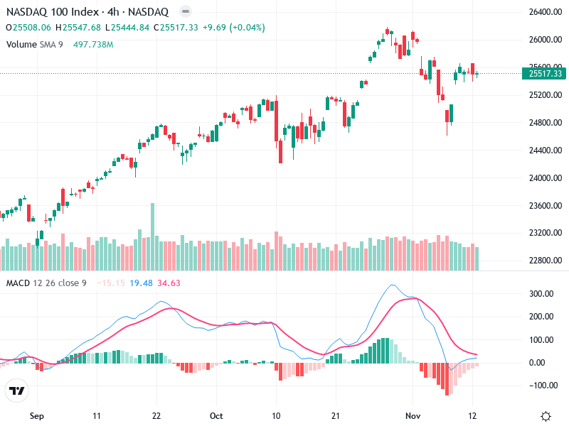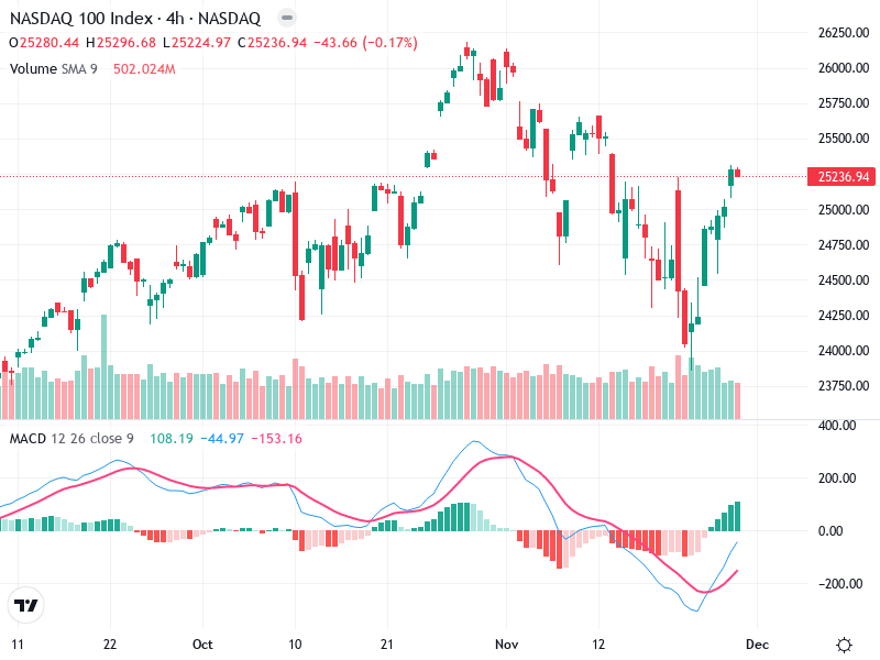 يُظهر الرسم البياني لمؤشر ناسداك 100 تعافيًا ملحوظًا بعد اتجاه هبوطي حديث، ويتجه نحو اتجاه صعودي