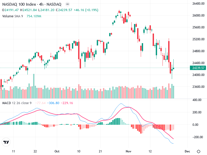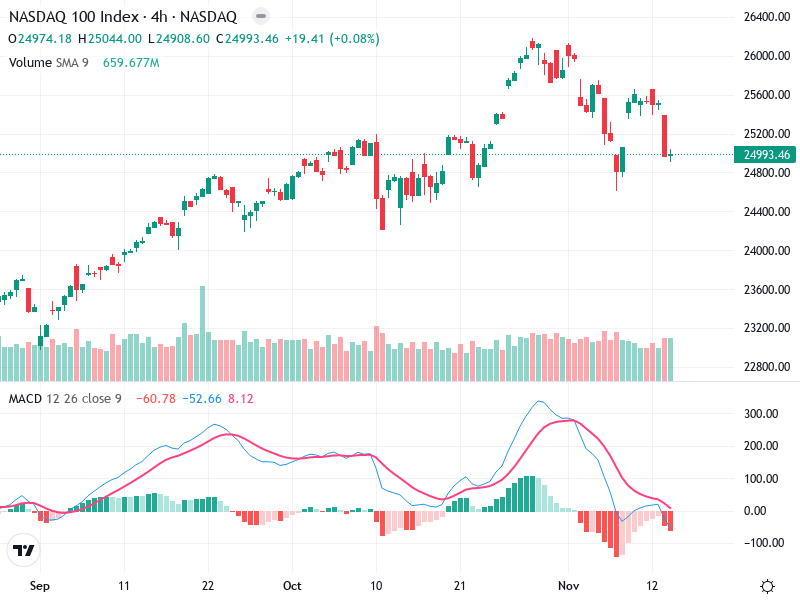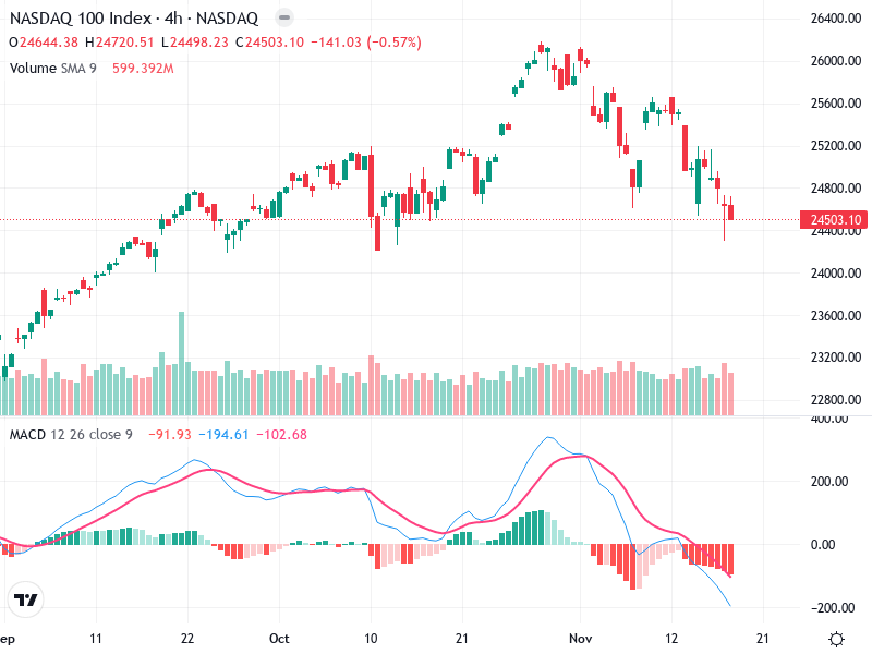 يظهر الرسم البياني لمؤشر ناسداك 100 اتجاهاً هابطاً واضحًا مع تكوين نماذج شموع سلبية. تشير المؤشرات