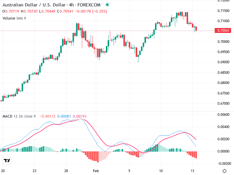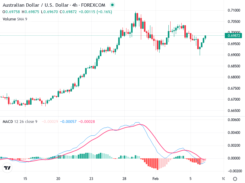 Consider a buy position if the bullish crossover in MACD confirms, targeting the resistance zone around 0.7050.