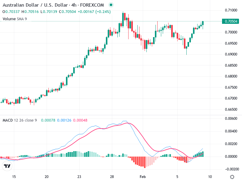 Monitor for bearish candlestick patterns or a MACD crossover bearish signal near the 0.710 resistance for potential short opportunities.