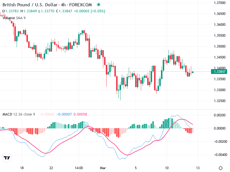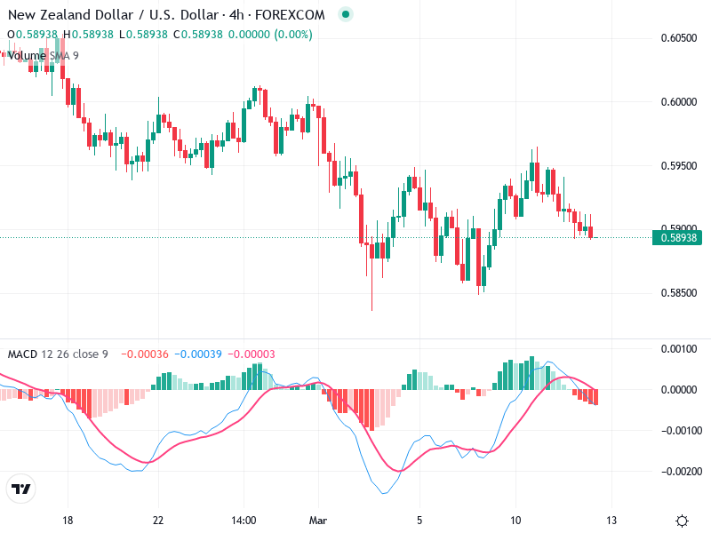 The MACD line currently sits below the Signal line, highlighting bearish momentum.