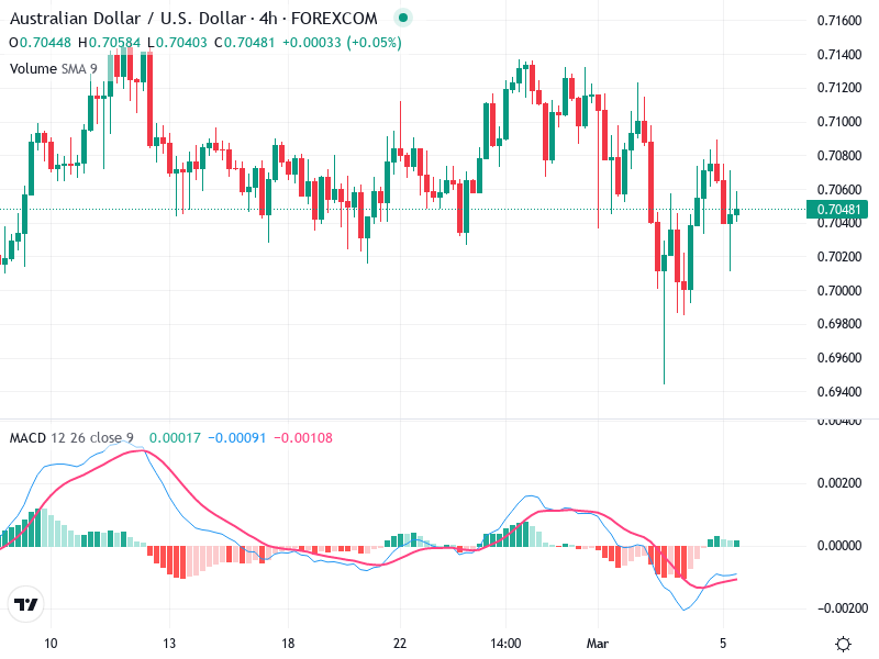 The current trend appears to be sideways with volatile price movements, as the price oscillates between approximately 0.6960 and 0.7120.