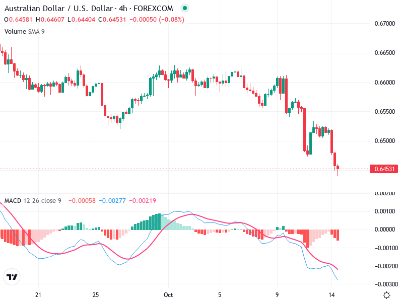 The AUD/USD 4-hour chart reveals a consistent bearish trend characterized by lower highs and lower lows. Notably, the price has slipped below the previous support, indicating a continuation of downward momentum.