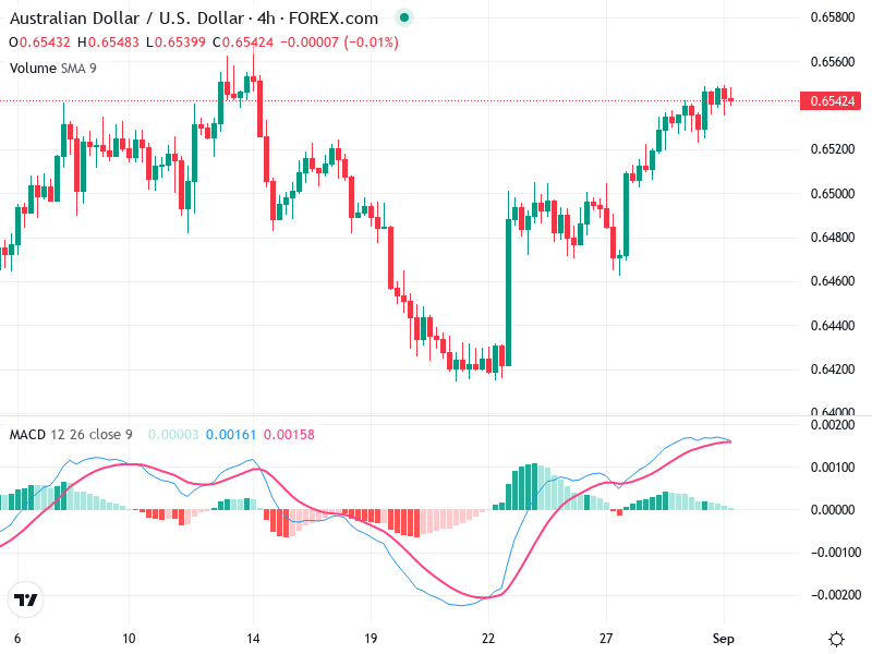 The AUD/USD 4-hour chart reveals a recent bullish reversal from a prior downtrend. The pair is testing a key resistance level at 0.6542. A breakout above this level could indicate further upward potential.