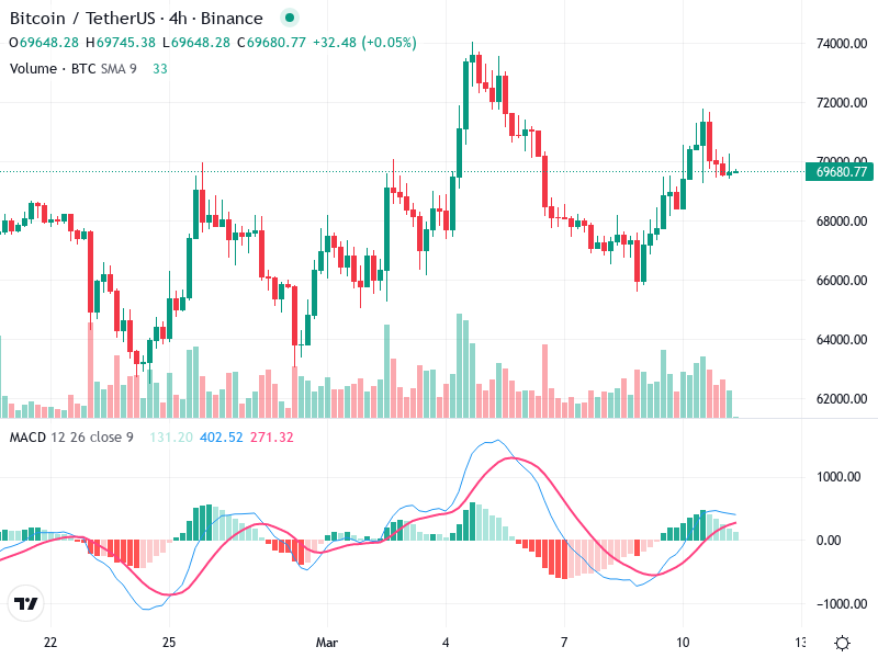 The chart nears a former resistance zone at 69000. Sustained movement above this level is crucial for breakout confirmation.