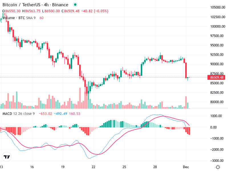 The histogram shows increasing negative values, reinforcing the bearish momentum and indicating the strength of the trend.