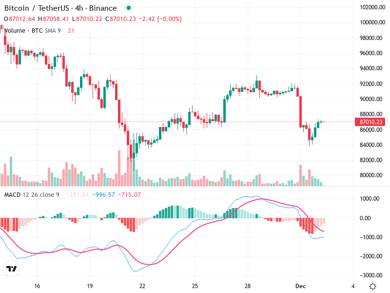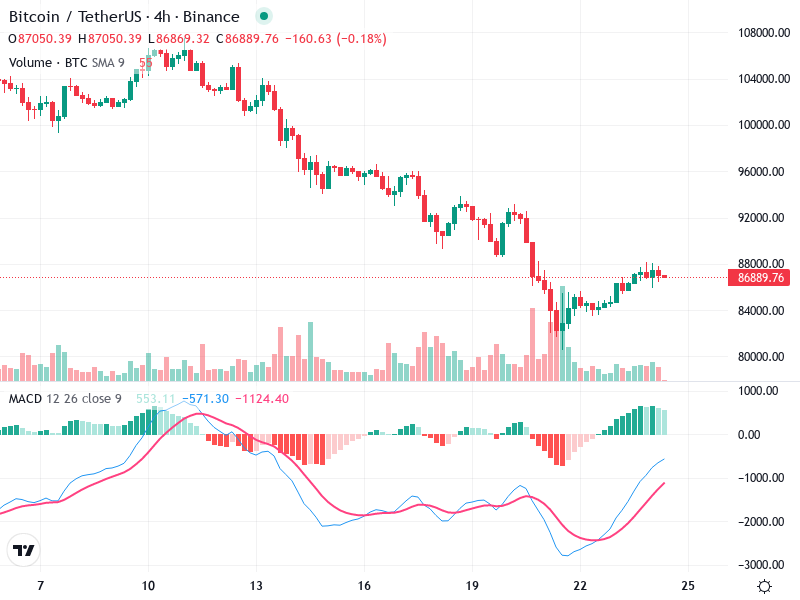 The Bitcoin /TetherUS chart reveals a recent bullish crossover indicated by the MACD, suggesting potential upward momentum.