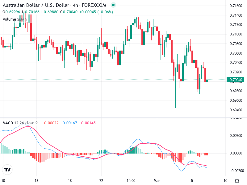 Trading volume supports the initial bullish momentum, but weakens as prices decline. The MACD indicates ongoing bearish momentum, with no current divergence signals.