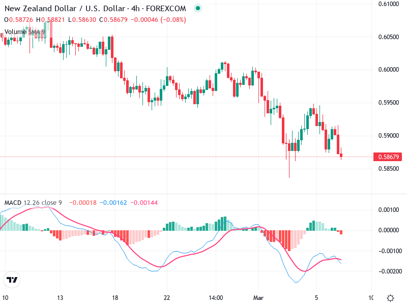 The MACD line is below the Signal line, indicating persistent bearish momentum.