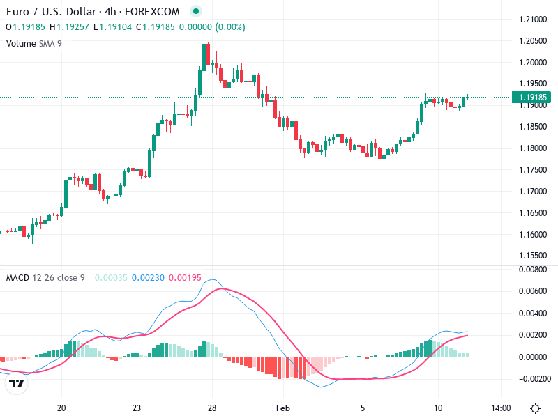 The EUR/USD 4-hour chart shows an initial uptrend transitioning into a sideways pattern before a minor recovery.