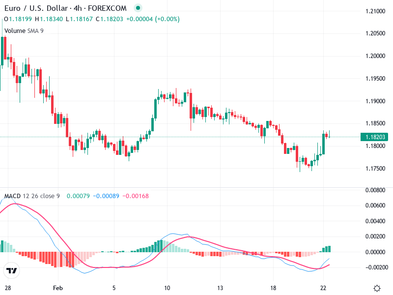 The MACD line is crossing above the Signal line, indicating a bullish crossover.