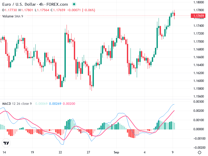 Watch for bearish candlestick patterns near the 1.1780 level for potential short-term selling opportunities if accompanied by declining volume and a bearish MACD signal.