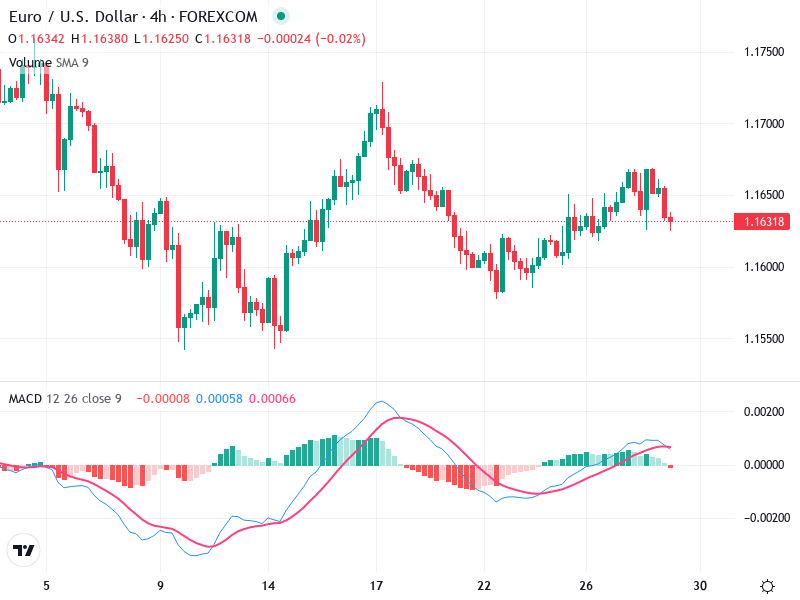 The EUR/USD chart currently presents a sideways market pattern, indicating consolidation at current levels.