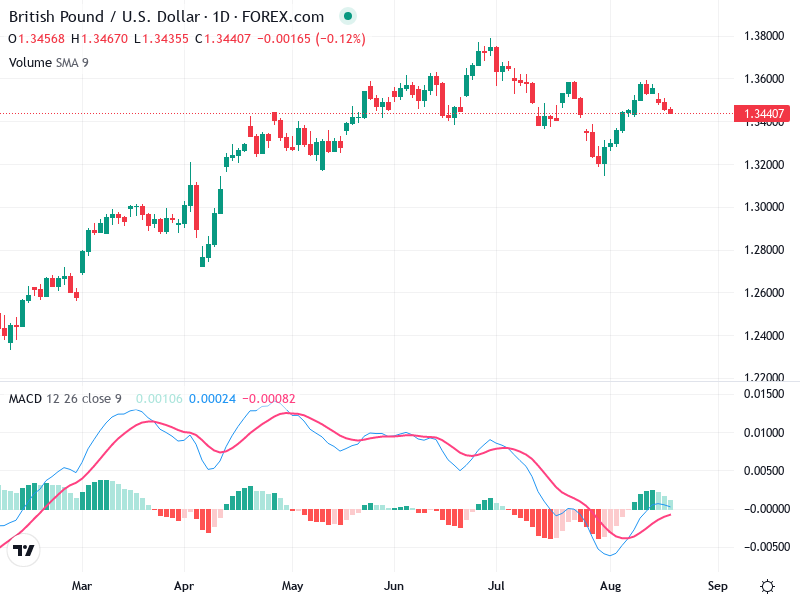 Consider entering long positions if the price holds above 1.3440 and the MACD maintains a bullish stance.