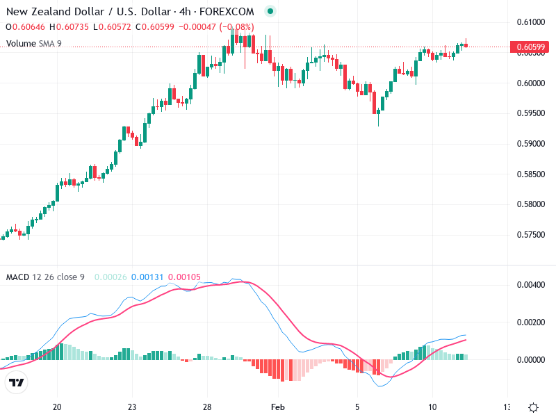 The 4-hour chart of the NZD/USD showcases the recent price movements and technical indicators. The pair has been trading in a somewhat bullish manner, with patterns suggesting potential future shifts.