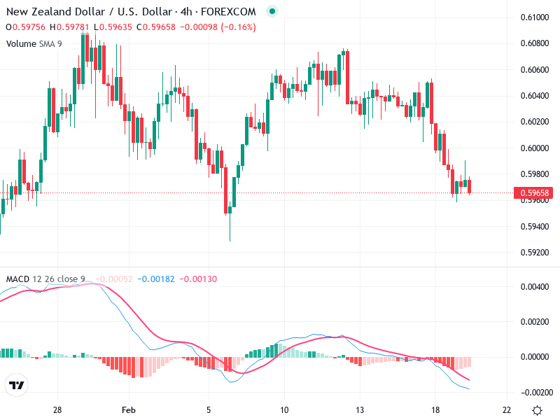 The NZD/USD 4H chart reveals ongoing bearish momentum. The asset’s price is under pressure near key support levels. Recent market activity points to potential downside with a cautious outlook on any reversals.