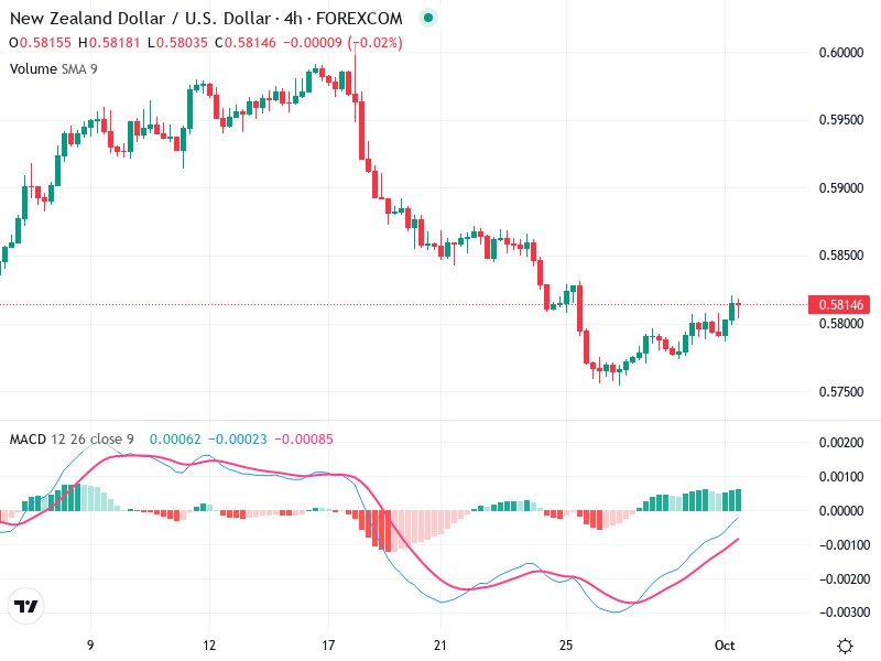 Watch for potential sell signals if the price fails to sustain above 0.58000, especially if accompanied by a bearish MACD crossover.